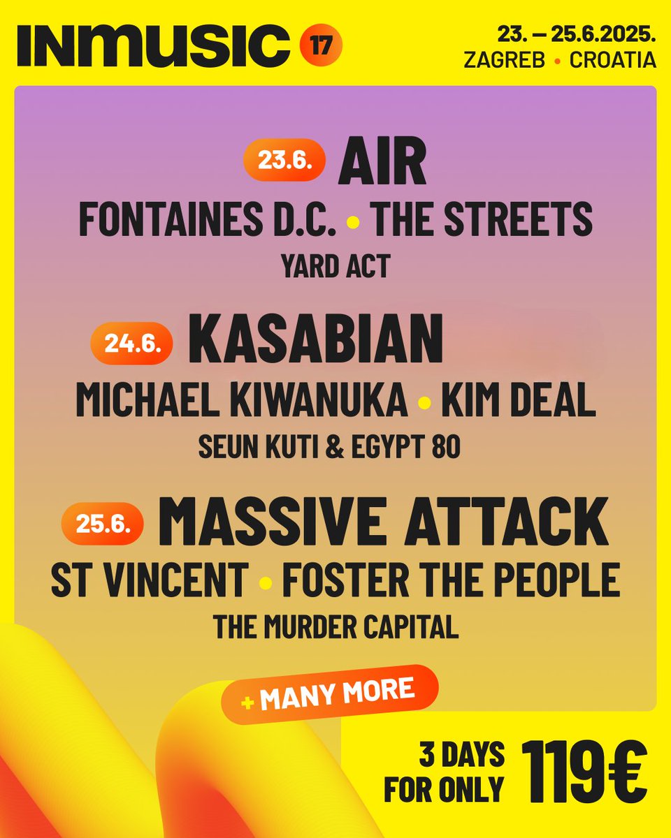 Festivalski kamp otvara se danas u podne, a brojni kamperi iz cijelog svijeta polako pristižu na jarunske otoke. Vrata festivala otvaraju se u ponedjeljak, 23. lipnja u 16:30 sati, kao i sve preostale festivalske dane. Ovogodišnji lineup donosi impresivnu kombinaciju velikih imena i novih muzičkh otkrića. Prvi dan festivala posjetitelje očekuje fantastičan nastup grupe Air, a uz njih će dan uveličati Fontaines D.C., The Streets, YARD i brojni drugi izvođači. Drugog dan INmusic festivala #17, 24. lipnja, donosi energične Kasabian, a prije njih nastupaju Michael Kiwanuka, Kim Deal, Press Club i mnogi drugi izvođači. Treći dan INmusic festivala, 25. lipnja, posjetitelje očekuje moćan nastup Massive Attack, a odličnu atmosferu zadnjeg dana festivala zagarantirat će St. Vincent, Foster the People, The Murder Capital uz brojne druge. Detaljan program i cjelovita festivalska satnica dostupni su putem linka: inmusicfestival.com/program/2025?view=lineup