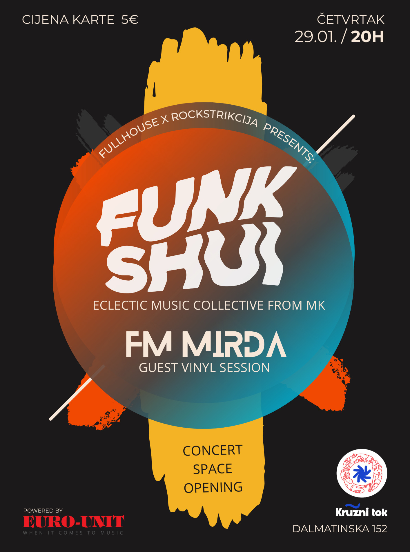 Podgorica dobija još jedan prostor za svirke. Radi se o Kružnom toku u Dalmatinskoj koji već neko vrijeme organizuje zanimljive događaje i akustične i eksperimentalne muzičke evente. Krajem januara ova adresa će imati i svoj prvi pravi koncert. Na mrežama su najavili “Koncertnu sezonu u novom prostoru u okviru @kruzni_tok_ započinjemo sa bendom @funkshui_. Prije i nakon njihovog nastupa za muzičku selekciju zadužen je @mirdafmuzzik. Uskoro više detalja o satnici i prodaji ulaznica.”