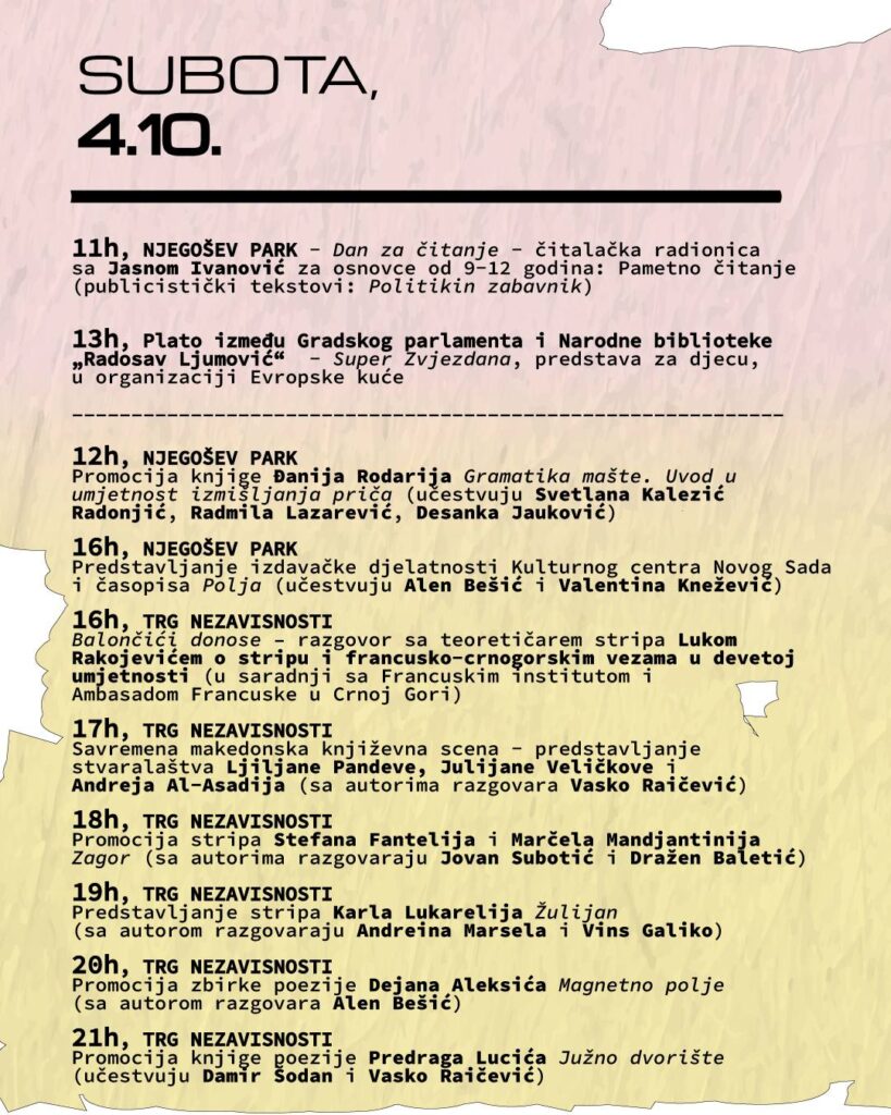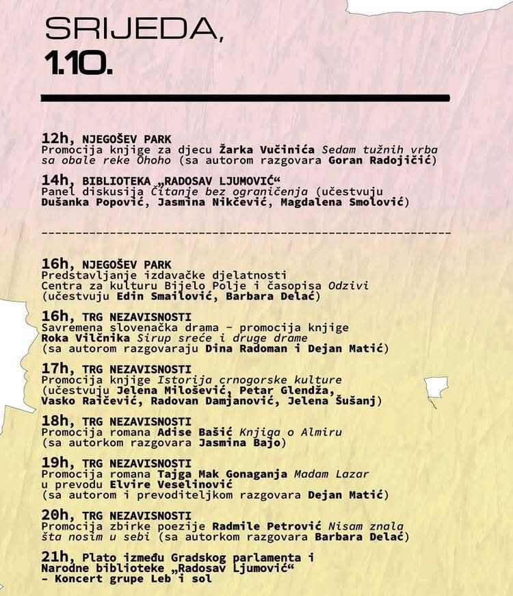 Nakon izuzetno uspješnog jubilarnog 10. sajma prošle godine, ovogodišnja transformacija u Festival ima za cilj da proširi i obogati kulturnu ponudu manifestacije. Pored sajamskog dijela, posjetioci će uživati u koncertima, filmskim projekcijama, pozorišnim predstavama, izložbama na otvorenom, promocijama, radionicama i programima za djecu.