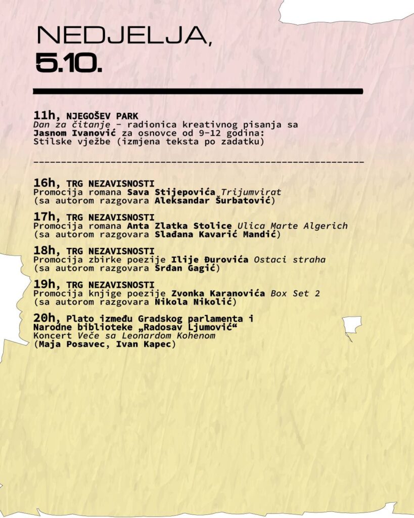 Premijerno izdanje nosi moto “Knjige su u centru”, što simbolizuje i Trg nezavisnosti kao glavno festivalsko središte, ali i vrijednosno opredjeljenje da književnost i kultura zauzmu centralno mjesto u društvenom životu. Tokom šest festivalskih dana biće realizovano više od 50 raznovrsnih programa – od predstavljanja novih izdanja i susreta sa poznatim piscima, do muzičkih i scenskih događaja na otvorenom.