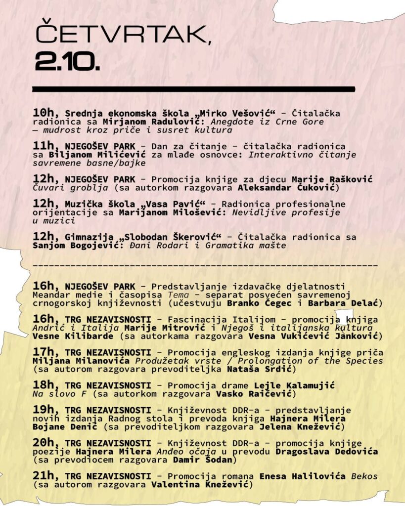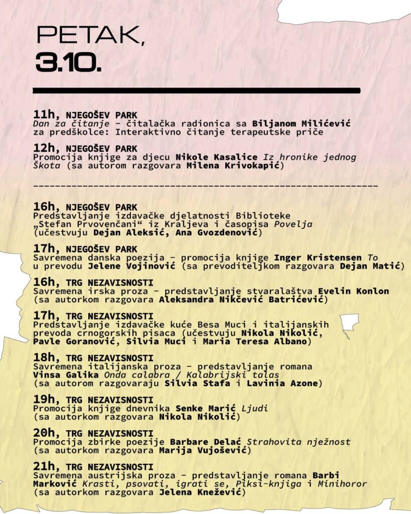 Festival će okupiti brojne ugledne autore iz Crne Gore, regiona i Evrope, stvarajući priliku za neposredne susrete s piscima, izdavačima i kulturnim stvaraocima. Kroz razgovore i promocije, književnost i izdavaštvo biće predstavljeni u najinspirativnijem obliku.
