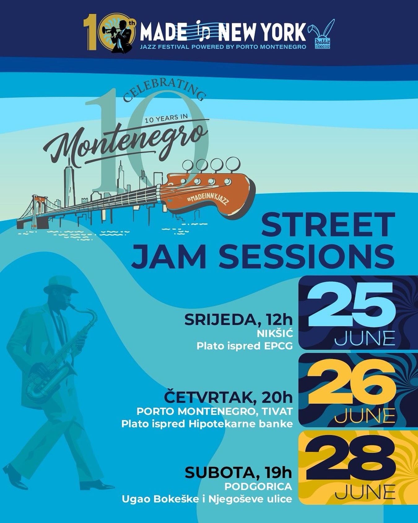 Deseti, jubilarni “Made In New York Jazz Festival Montenegro, održava se od 26. do 29. juna 2025. u strateškom partnerstvu sa kompanijom Adriatic Marinas (Porto Montenegro) i u izvršnoj produkciji crnogorske kompanije “Rabbit Records”